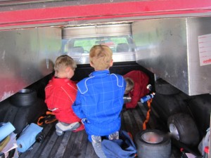 Once we got to Badger, Jason perked up when he saw his new kart and ran to sit in it again. We hung out there for a bit with the Verhings, the whole family was there, talking about how the season was going for the various clubs and tracks and plans for next year. Finally, we got Jason out the kart and the kart into the truck bed(with the little kart on the cap roof). We headed home stopping for some pizza, leg medicine for Jason, after a very long but successful weekend.