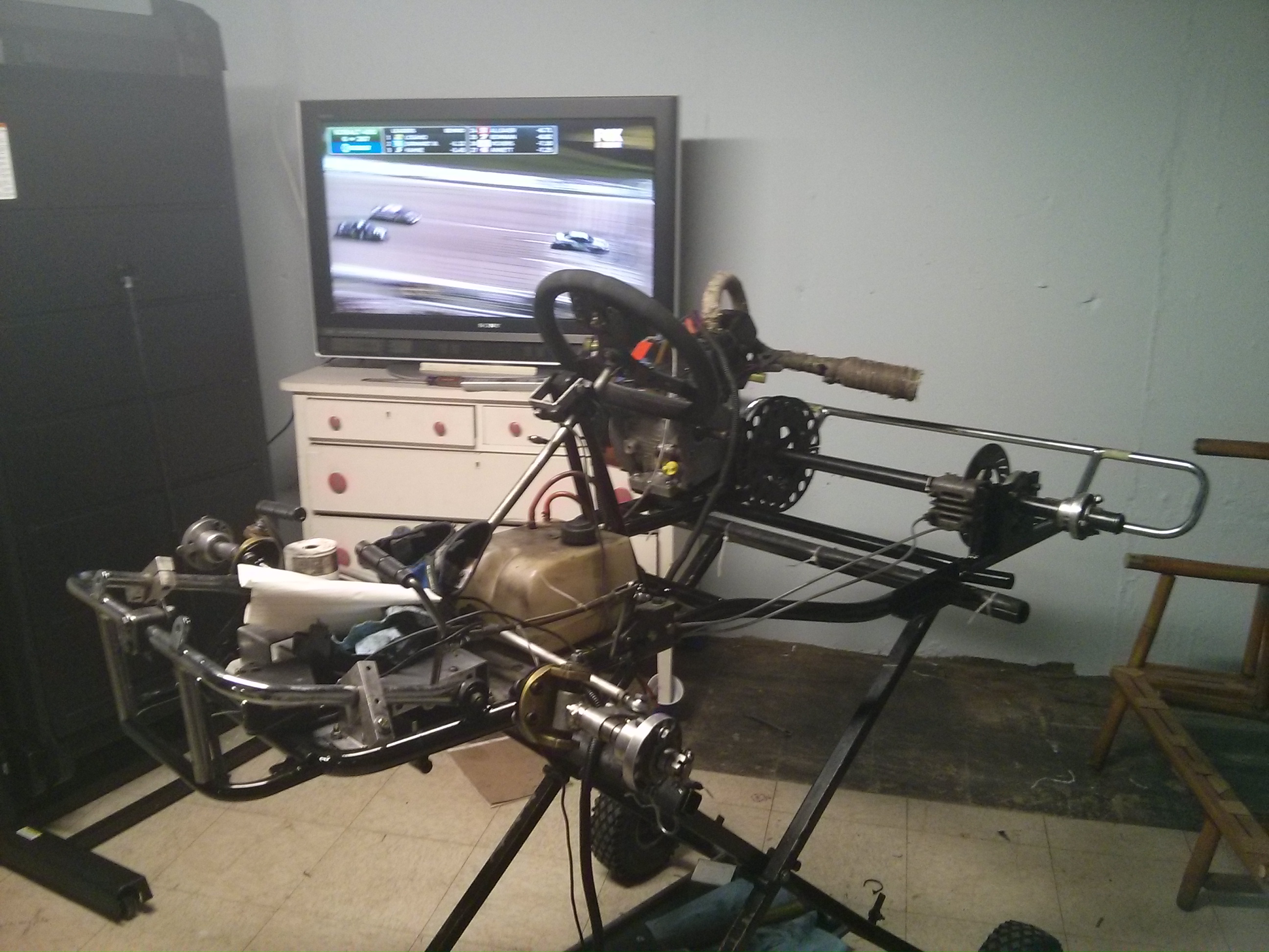 So, after much consideration and number crunching, we headed to 4 Cycle Central to pick up the refreshed motors and a 2004 Coyote Kryptonite. While we where there we added seats, installed the motors, and aligned and scaled the karts. To scale the kart we put each wheel on a scale and then made sure that the weight was equal with a slight bias toward the rear. The balance makes sure that the kart can turn equally well left and right, and the rear bias helps keep the rear wheels and the power on the ground.