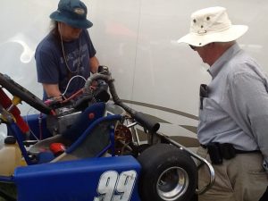 Saturday was pretty good, aside from losing a wheel on the road kart. Jason helped scale the kart and missed the cotter pin holding the lug on and the wheel, which quickly came loose once he was on the track. The racing was great. Jason and Keith, a senior super heavy driver had a great race. They swapped places almost every lap, sometime more than once. Jason could catch Keith in the corners but Keith would pull away on the straights. Keith’s timing was just a bit better and he was looking for to beat Jason when his frame broke two laps from then end and he slowed. Sunday things got a little rough when the clutch came off the road kart in the first practice and the belt broke in the second practice, but we got things sorted for the races. Jason finished first in all four of the weekends races.