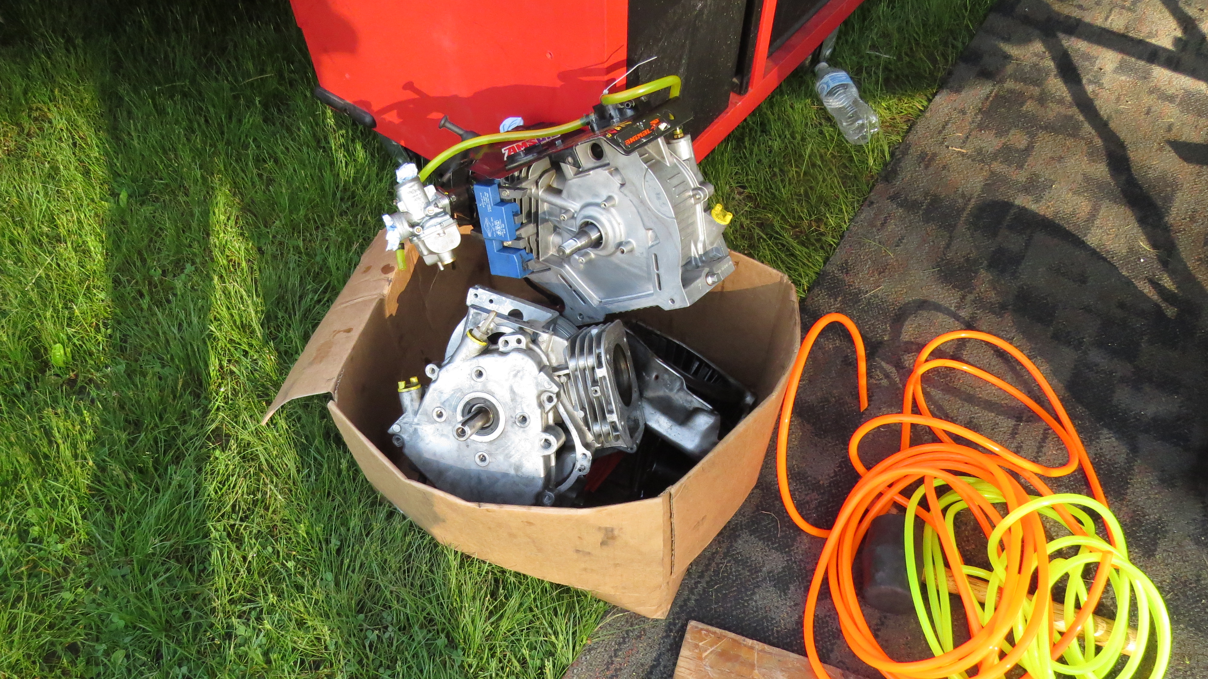 After racing was over there was time to get some extra practice in, practice and racing was earlier hampered by rain and a wet track.  Unfortunately, the motor very quickly died.  With the kart back in the pit we put the last motor on, filled it with oil and gave it a test start.  It immediately started leaking oil from the crank seal.  We started tearing down the motor and found the case had cracked from top to bottom allowing the crank seal to easily pop out.  We were out of motors and had just begun to think about what to do next, when Jason appeared with two motors.  Reagan and Jack lent us motors for Sunday racing and a backup for Mid-Ohio should we need it.