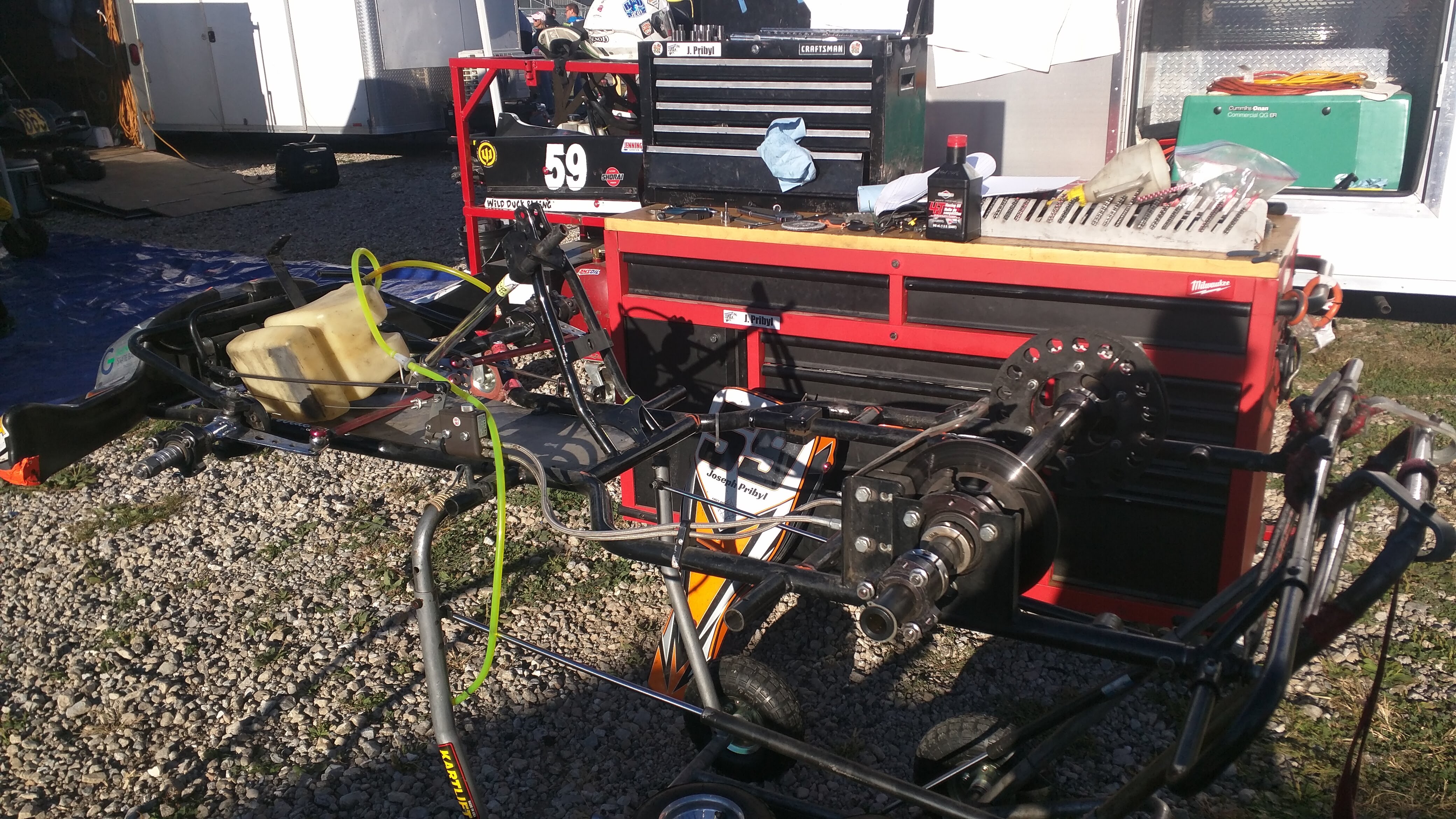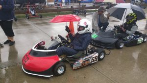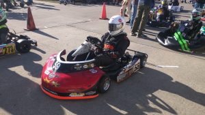 We arrived just after the gates closed on Thursday night and sleep on the floor of the trailer in the parking lot so we could get in early on Friday morning. Since this was something like an arrive and drive, it was all hands from Coyote and Wild Duck Racing getting Jason’s kart build before practice. We took the combat frame as a base and then tore down our two coyote wide tracks for parts, creating a hybrid bodied kart ready for racing in just about 2 hours. We then executed the plan day of practice. First get Jason used to the new kart and correcting things like improper steering shaft length quickly. Then on to tuning to get the kart up to speed. The afternoon of practice was was started a freshened motor and new tires for some qualifying practice ending the day running in front to see who was catching us. All day the kart kept moving faster and near the top 10 of a 43 kart field. The team put in a solid 12+ hours picking up 2 second throughout Friday just to keep up with the field.