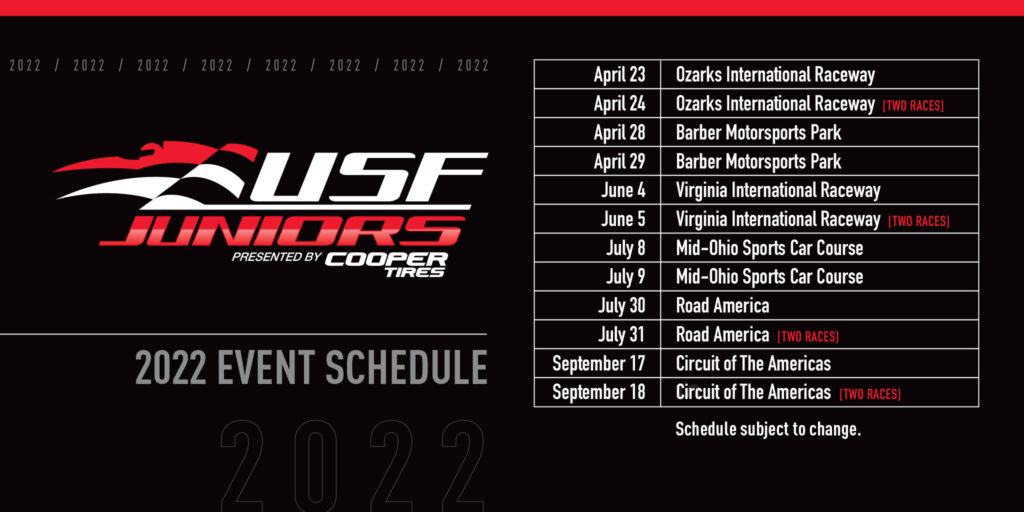 About USF Juniors Presented by Cooper Tires: USF Juniors debuts in 2022 as a pre-step to the highly acclaimed Road to Indy Presented by Cooper Tires driver development platform, a clear-cut path to the NTT INDYCAR SERIES. Owned and operated by Andersen Promotions with sanctioning from USAC Racing, the entry level series is professionally run to Road to Indy standards providing the necessary training on and off the track to drivers as young as 14 years of age. A prize package of over $310,000 is on offer including a scholarship valued at more than $220,000 for its champion to advance to the first step of the ladder – the Cooper Tires USF2000 Championship – in 2023. For more information, visit usfjuniors.com.